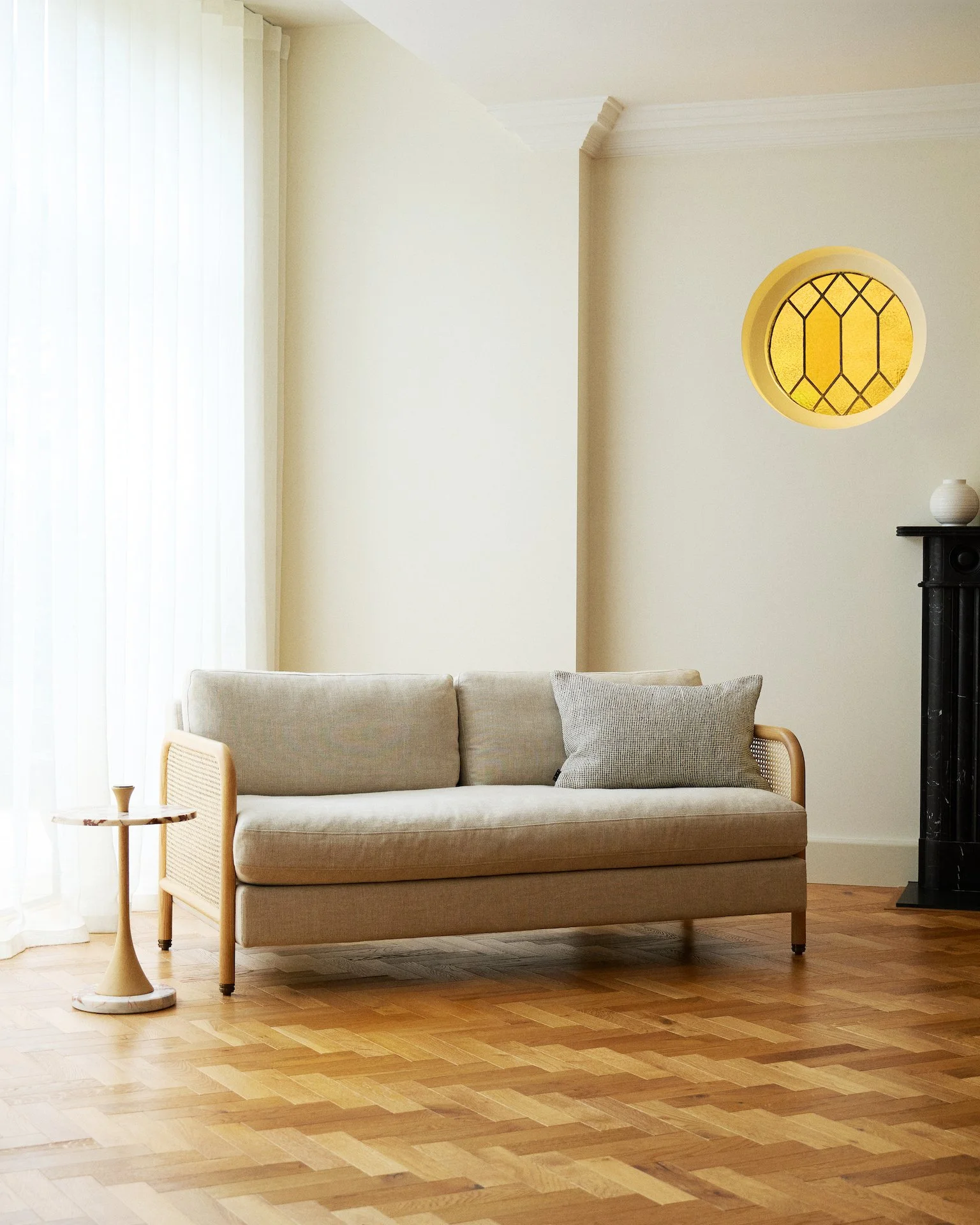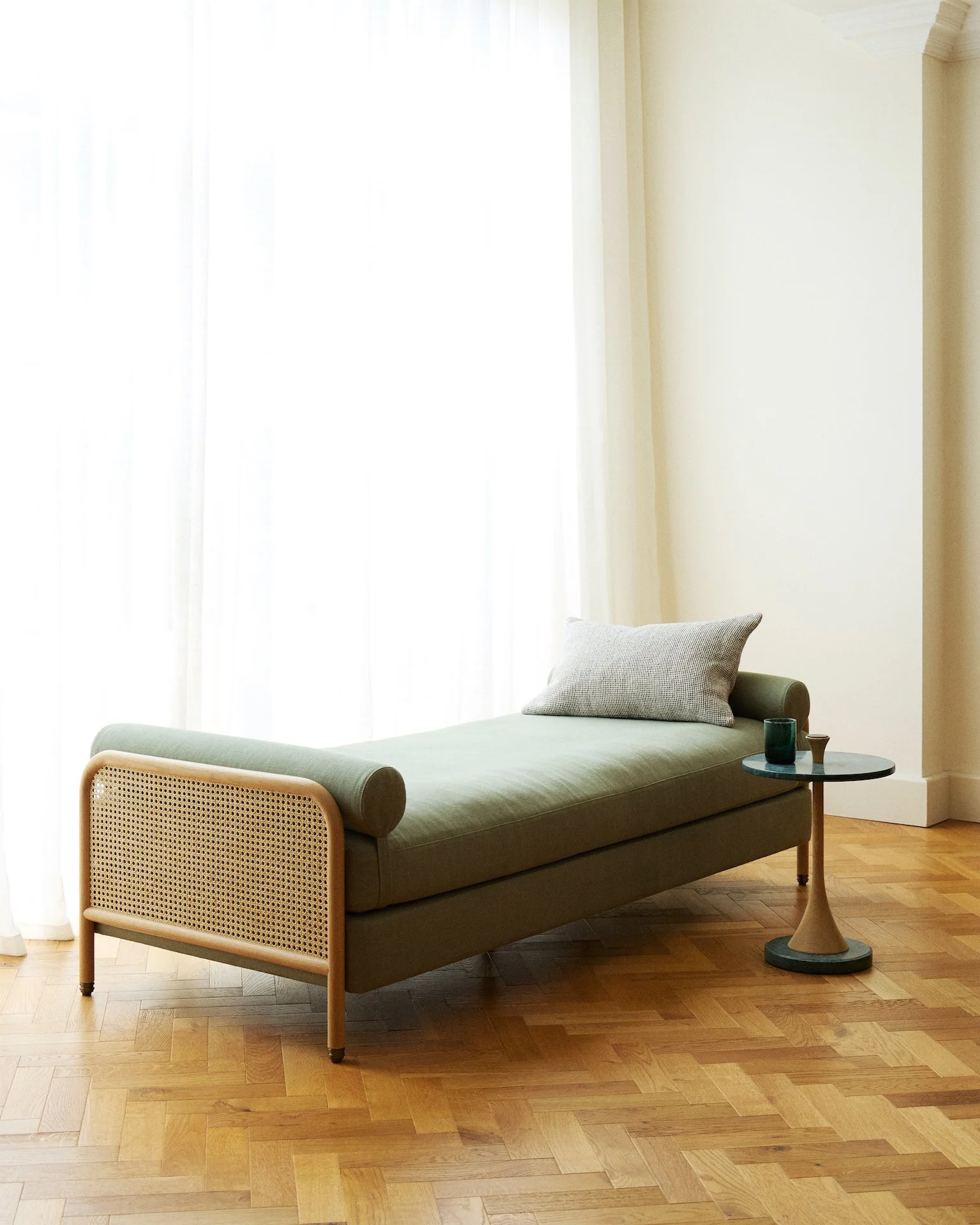 The range includes an armchair, daybed, and two- seater, each crafted with a solid oak frame, natural rattan side panels, and Belgian linen upholstery in a choice of Oatmeal, Sage, or Dahlia. Complementing the seating is a pair of marble side tables, available in either Bulgari Red or Verde Marl tops, both set on coordinating oak bases.